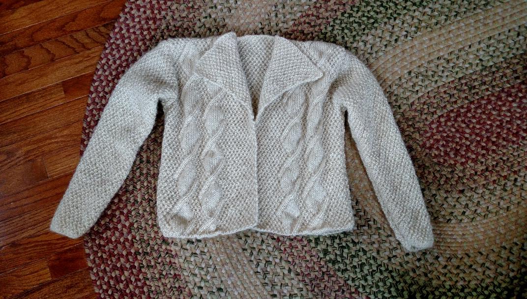 I had this pattern in the closet. I don't particularly like the way the collar turned out, and I'm not sure I will ever wear it. I only washed this once and it is still pretty rough. Pattern: 7187 Woman's Jacket by Sirdar