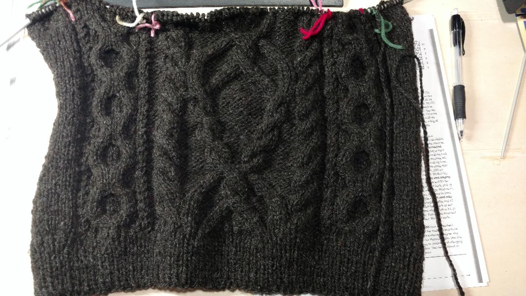 This is the back panel on a Highway 61 Pullover. It is from Interweave, and so far, I love love love it. I was a bit leery it would turn out too small, but I am currently at gauge so fingers crossed. I am always to nervous it won't fit when I am done. This project is seamed, but I like to pretend I don't like but I secretly think I do. At least, for Aran jumpers.